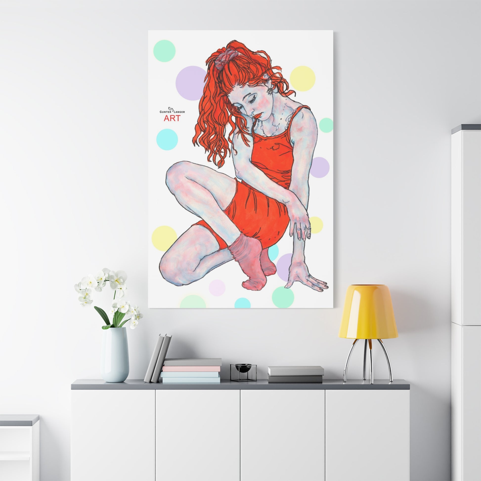 „Julia“ ist ein sinnliches Motiv voller Anmut. Die Darstellung einer Frau im roten Kleid mit rot fließendem, wallendem Haar, zieht den Blick sofort in ihren Bann. Die weichen Linien und die farbigen Segmente verschmelzen zu einer beinahe träumerischen Harmonie, die Ruhe und Sehnsucht zugleich auslöst. Das Motiv „Julia“ gehört nicht ohne Grund zu unseren Bestsellern. Dieses Bild ist ein echtes Schmuckstück für Ihre Wand.